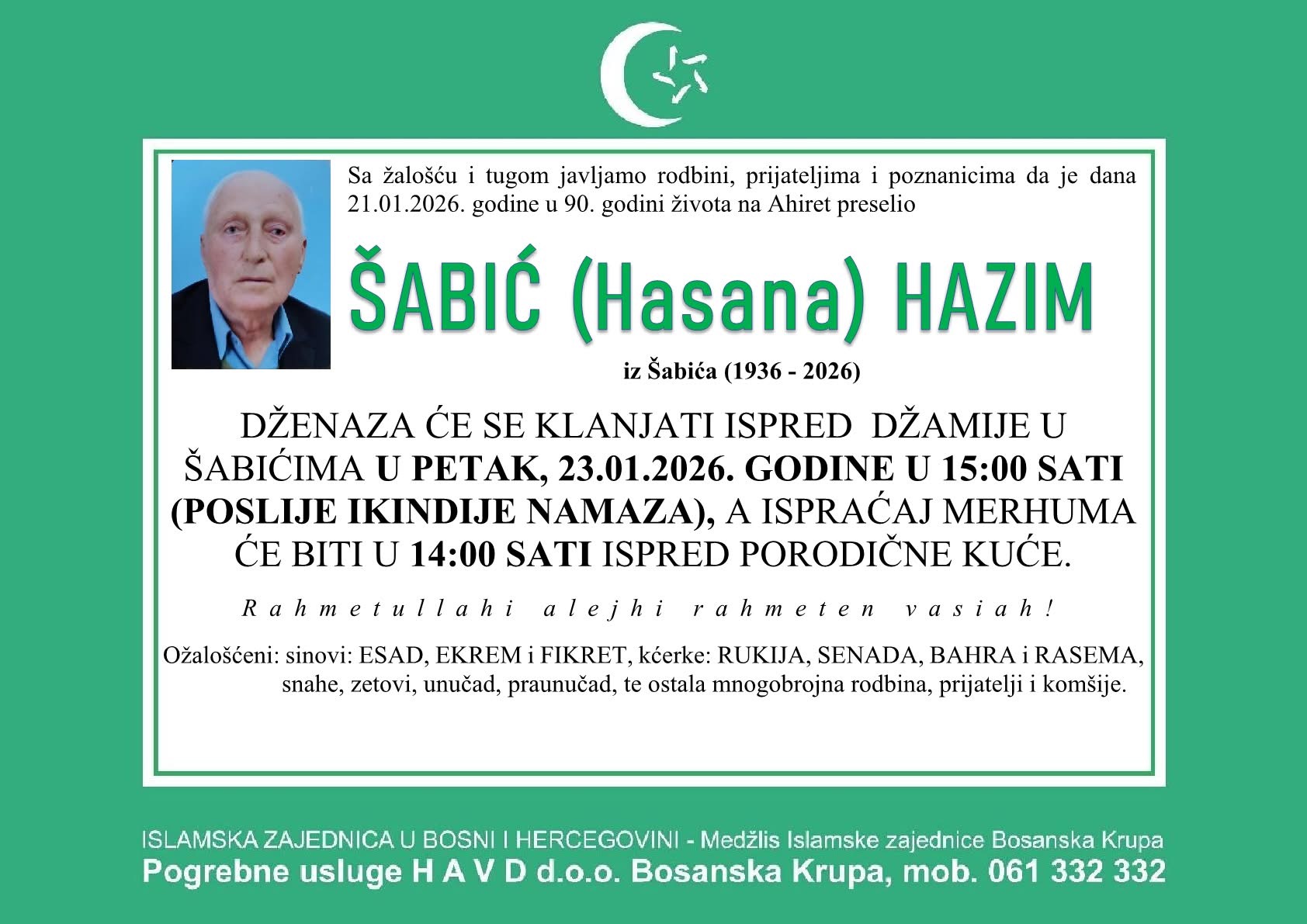 Dženaza će se klanjati ispred džamije u Šabićima u petak, 23.01.2026. godine u 15:00 sati (poslije ikindije namaza), a ispraćaj merhuma će biti u 14:00 sati ispred porodične kuće.