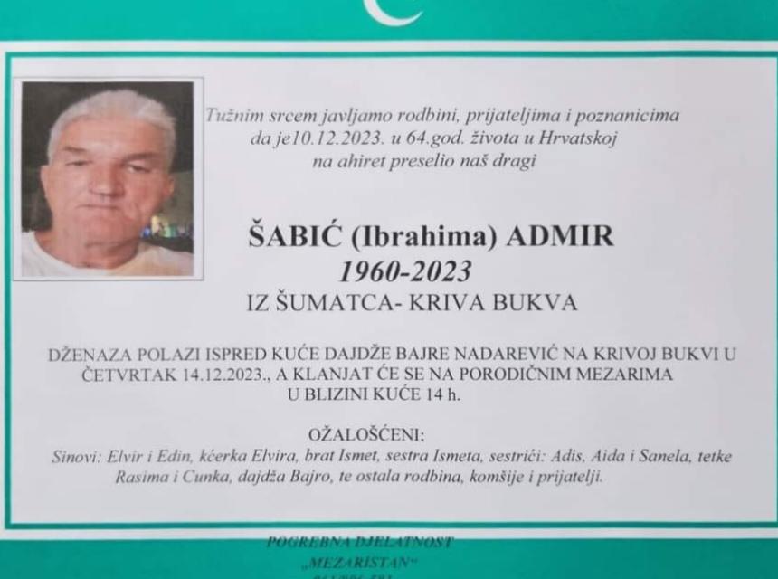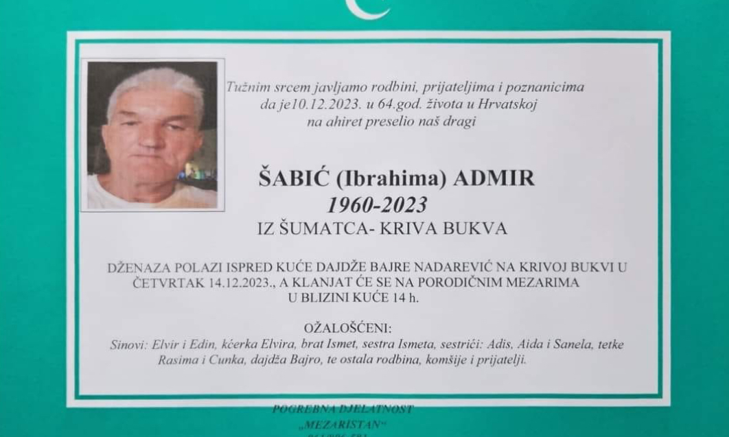 Tužnim srcem javljamo rodbini, prijateljima i poznanicima da je 10.12.2023. u 64.god. života u Hrvatskoj na ahiret preselio naš dragi ŠABIĆ (Ibrahima) ADMIR.