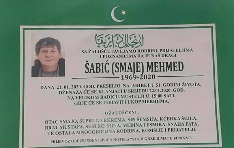 Tužnim srcem i bolom u duši javljamo rodbini i prijateljima da je naš dragi Šabić (Smaje) Mehmed u 51. godini života preselio na Ahiret 21.01.2020. godine.