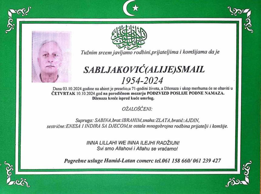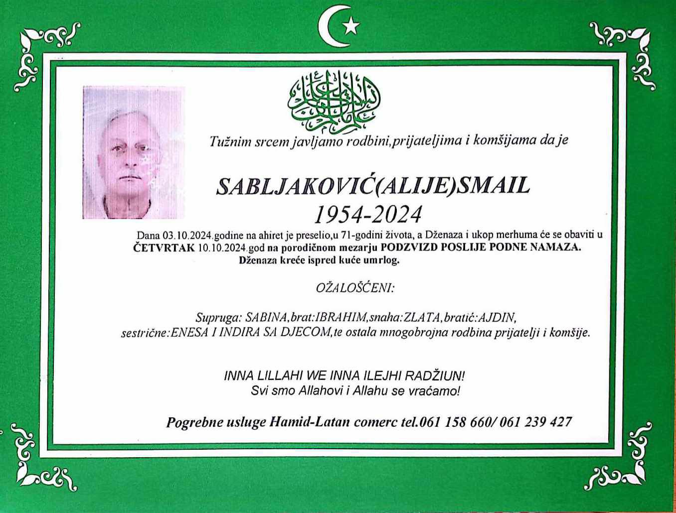 Obavještavamo rodbinu i prijatelje da je 03.10.2024 godine na Ahiret u 71. godini života preselio Sabljaković (Alije) Smail.