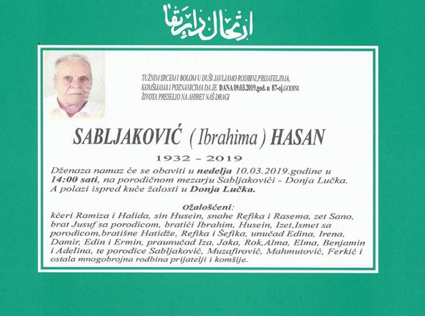 Tužnim srcem i bolom u duši javljamo rodbini, prijateljima, komšijama i poznanicima da je dana 09.03.2019. godine u 87-oj godini života na Ahiret preselio naš dragi Sabljaković (Ibrahima) Hasan.
