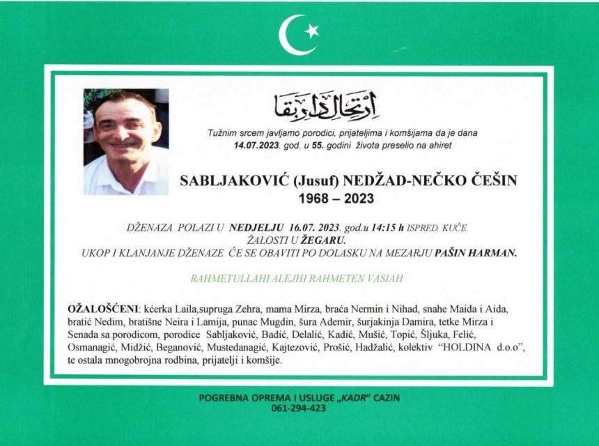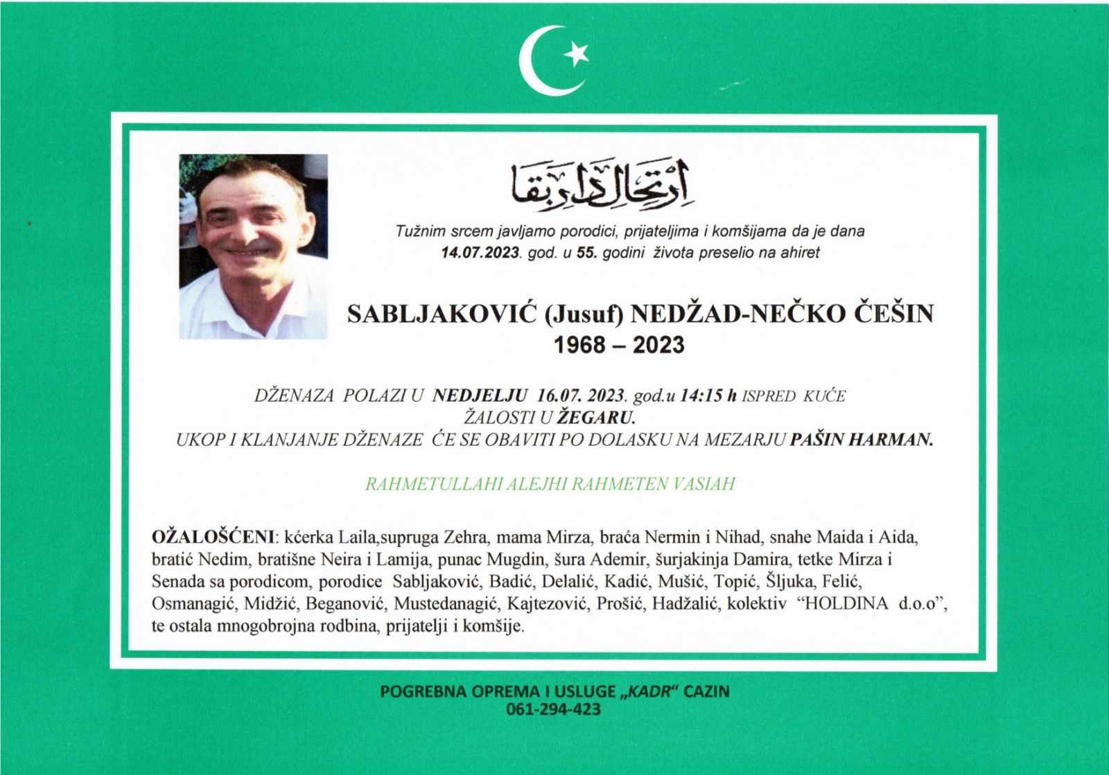 Tužnim srcem javljamo rodbini, prijateljima i komšijama tužnu vijest da je naš dragi Sabljaković (Jusuf) Nedžad – Nečko Češin, dana 14.07.2023.godine u 55-oj godini života, preselio na Ahiret.