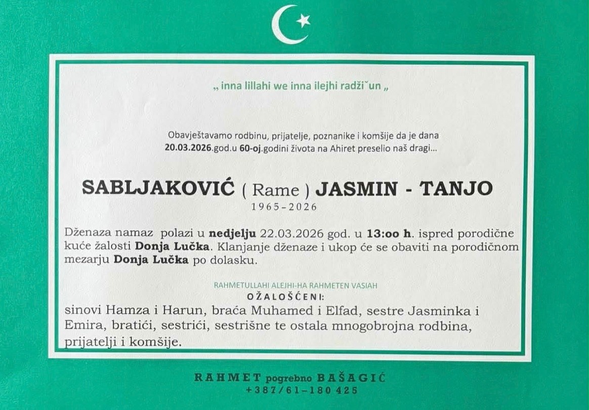 Dženaza namaz polazi u nedjelju 22.03.2026. god. u 13:00 h. ispred porodične kuće žalosti Donja Lučka. Klanjanje dženaze i ukop će se obaviti na porodičnom mezarju Donja Lučka po dolasku.
