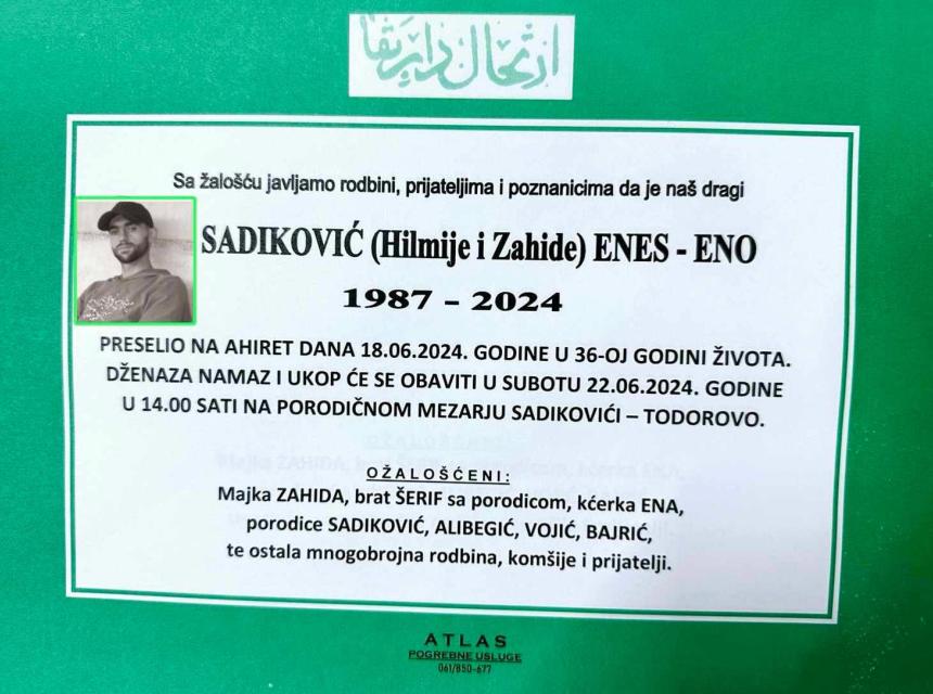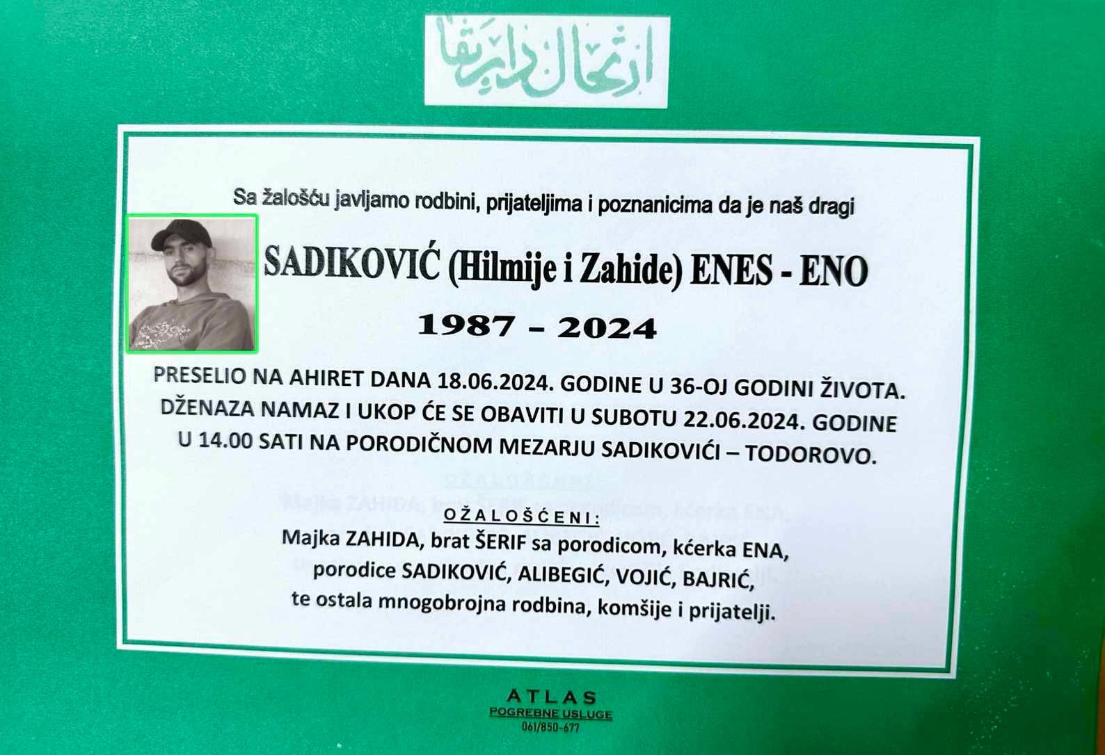 Tužnim srcem i bolom u duši javljamo rodbini, prijateljima i komšijama da je naš dragi Sadiković (Hilmije i Zahide) Enes - Eno, dana 18.06.2024. godine u 36-oj godini života, preselio na Ahiret.