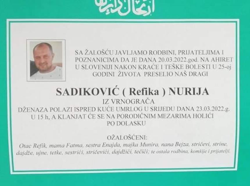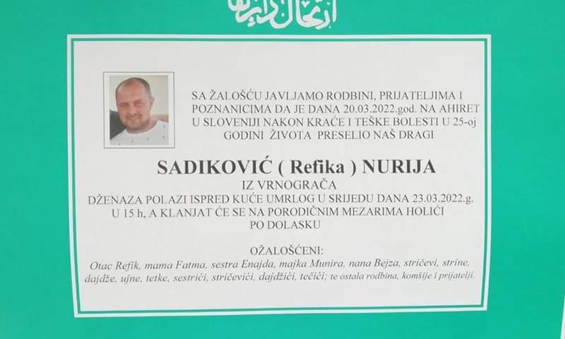 Tužnog srca i s bolom u duši obavještavamo rodbinu, komšije i prijatelje da je naš dragi Sadiković (Refika) Nurija 20.03.2022. u 25. godini života preselio na Ahiret.