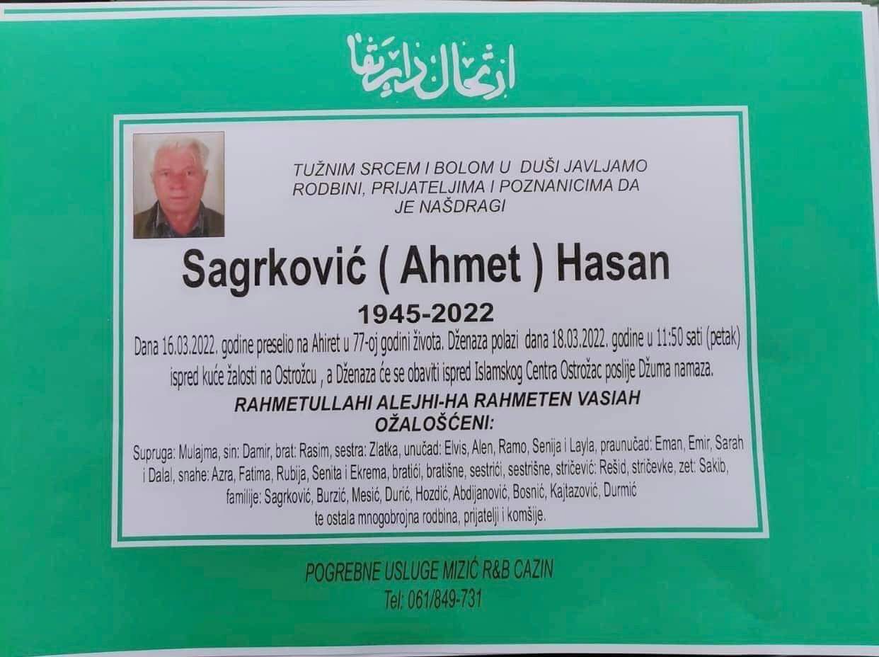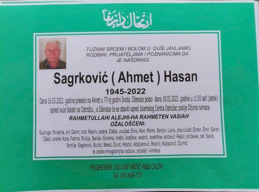Tužnog srca i s bolom u duši obavještavamo rodbinu, komšije i prijatelje da je naš dragi Sagrković (Ahmet) Hasan 16.03.2022. u 77. godini života preselio na Ahiret.