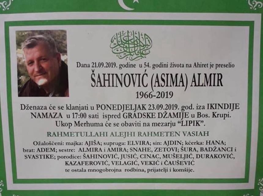 Dana 21.09.2019. godine u 54. godini života na Ahiret je preselio Šahinović (Asima) Almir. Dženaza će se klanjati u ponedjeljak 23.09.2019. god. iza ikindije namaza u 17:00 sati ispred gradske džamije u Bos. Krupi. Ukop Merhuma će se obaviti na mezarju Lipik.
