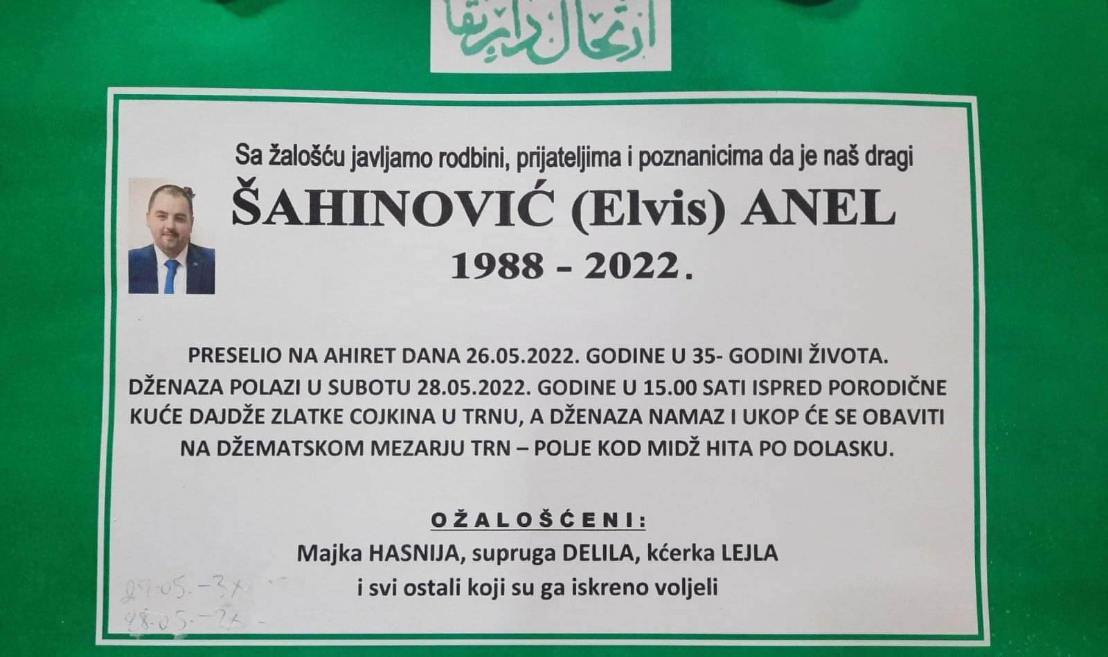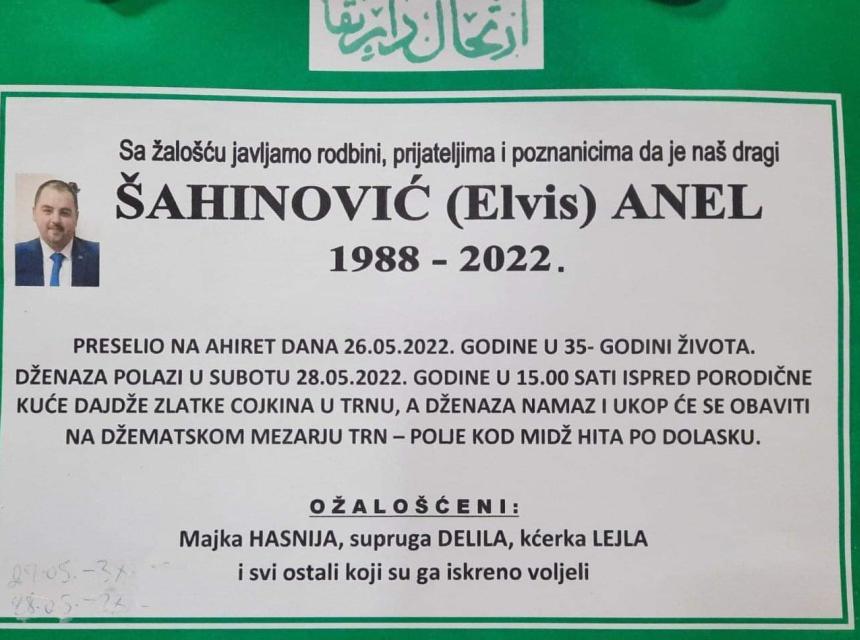 Tužnog srca i s bolom u duši obavještavamo rodbinu, komšije i prijatelje da je naš dragi Šahinović (Elvis) Anel u 35. godini života preselio na Ahiret.