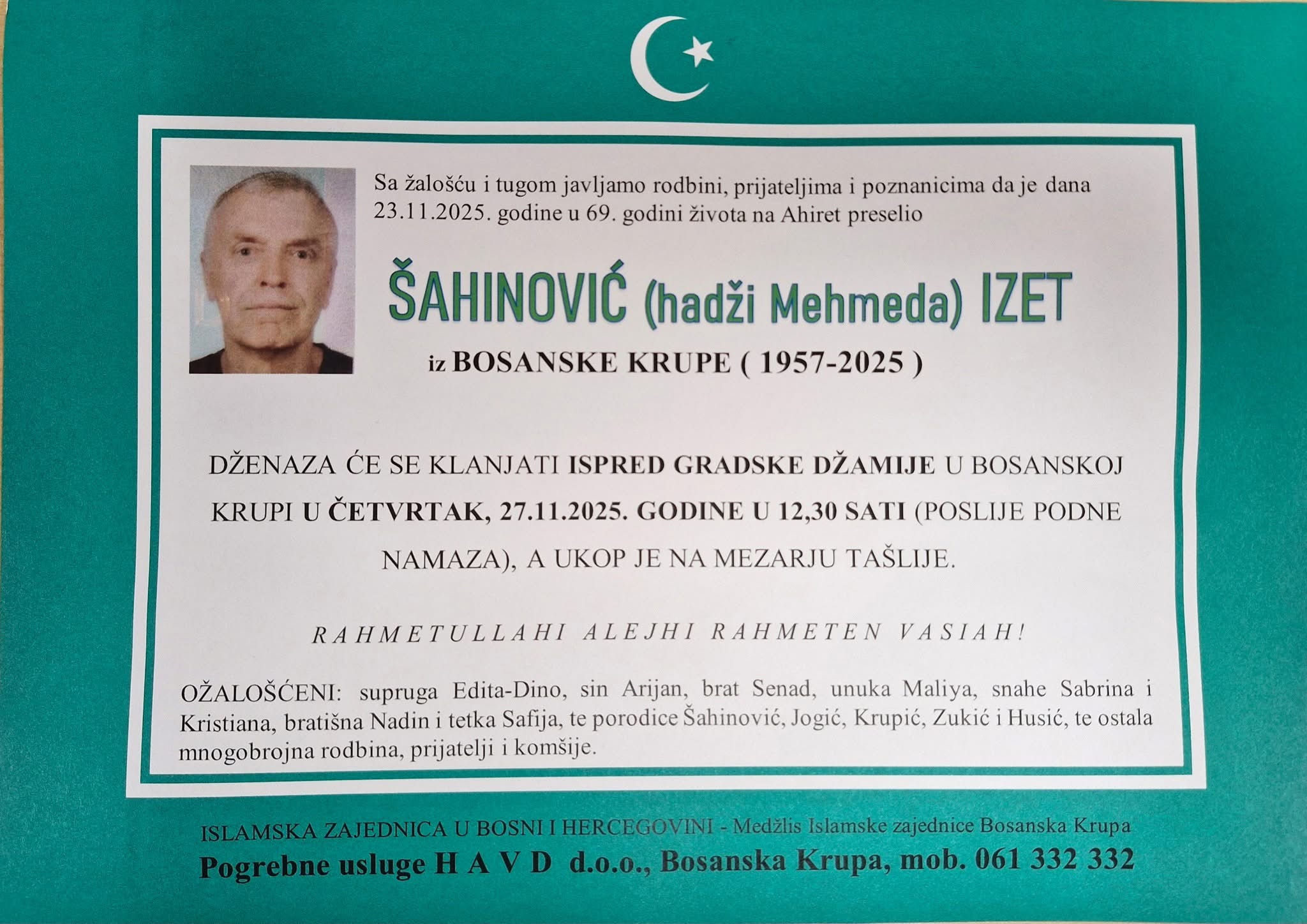 Dženaza će se klanjati ispred Gradske džamije u Bosanskoj Krupi u četvrtak, 27.11.2025. godine u 12:30 sati (poslije podne namaza), a ukop je na mezarju Tašlije.