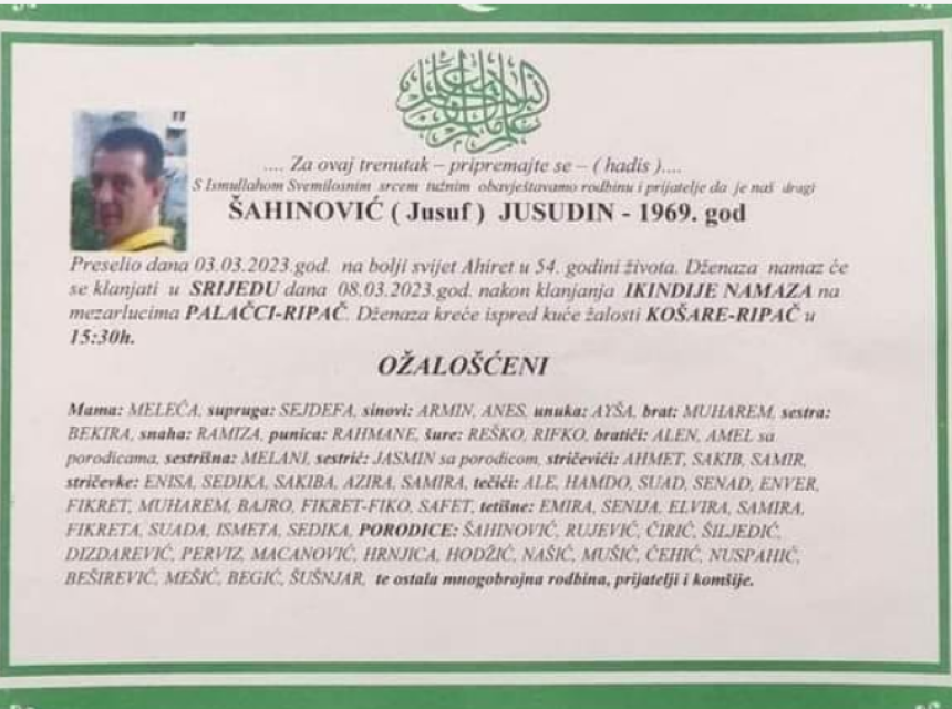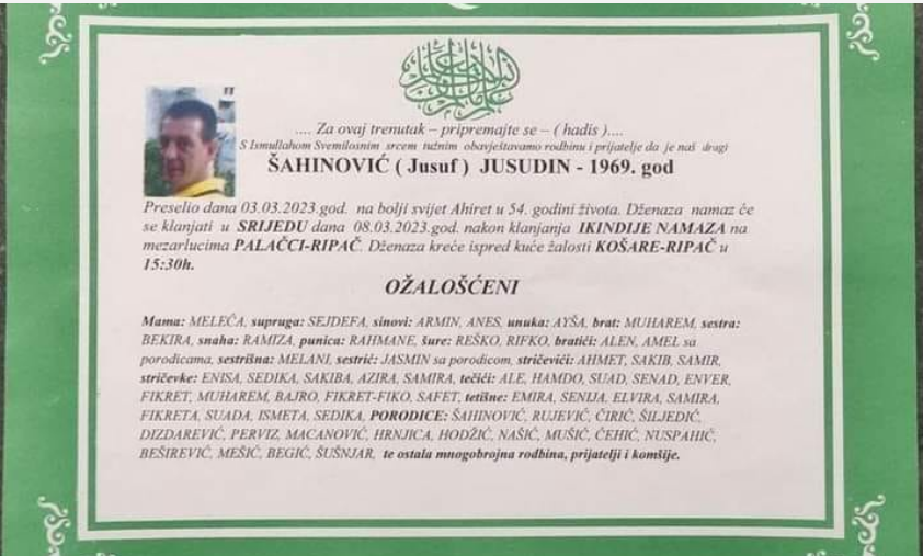 Tužnim srcem javljamo rodbini, prijateljima i komšijama tužnu vijest da nam je naš dragi Šahinović (Jusuf) Jusudin dana 03.03.2023. godine na ahiret preselio u 54-oj godini života.