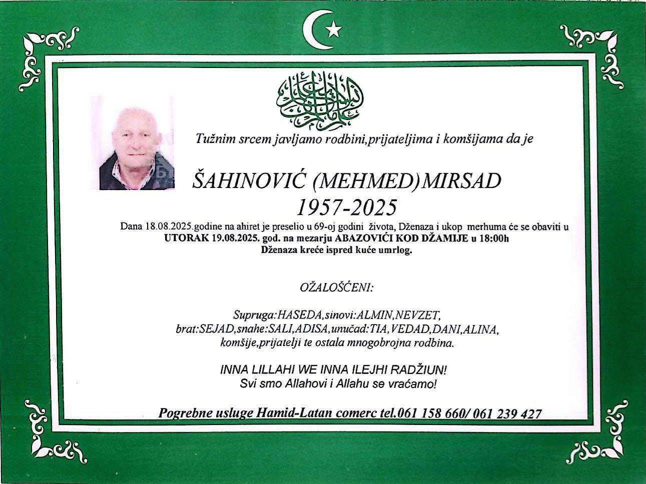 Dženaza i ukop milog nam rahmetlije obavit će se dana 19.08.2025. godine (utorak) na mezarlucima "Abazovići" u 18:00 sati. Dženaza kreće ispred kuće umrlog