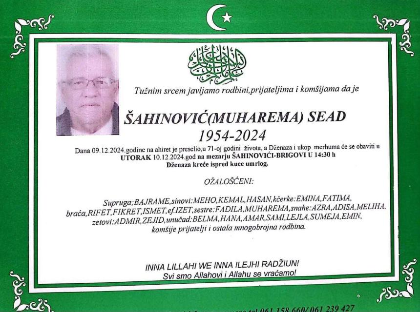 Duboko ožalošćeni obavještavamo rodbinu, prijatelje i komšije da je dana 09.12.2024. god. u 71-oj godini života na ahiret preselio Šahinović (Muharema) Sead.