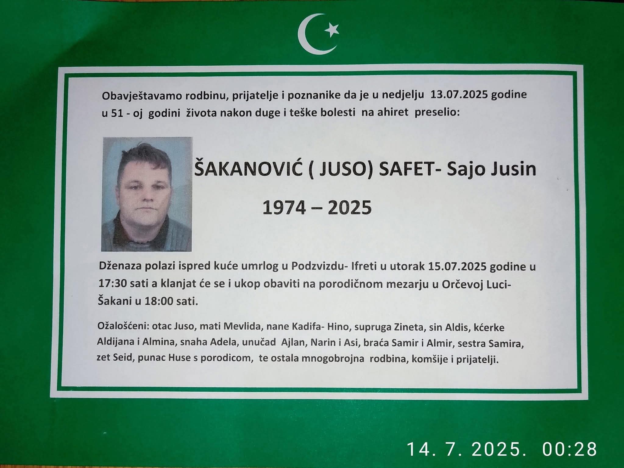17:30 sati a klanjat će se i ukop obaviti na porodičnom mezarju u Orčevoj Luci – Šakani u 18:00 sati.
