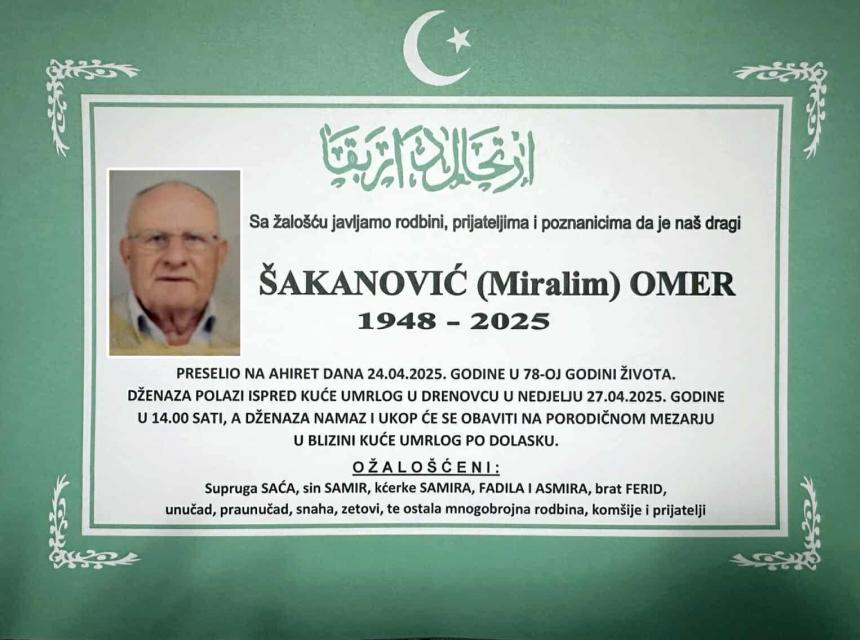 Dženaza polazi ispred kuće umrlog u Drenovcu u nedjelju 27.04.2025. u 14:00 sati, a dženaza namaz i ukop će se obaviti na porodičnom mezarju u blizini kuće umrlog po dolasku.