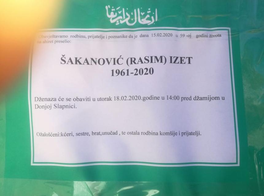 Dženaza će se obaviti u utorak 18.02.2020. godine u 14:00 sati ispred džamije u DONJOJ SLAPNICI.