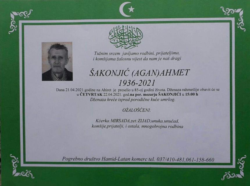 Tužnog srca i s bolom u duši obavještavamo rodbinu, komšije i prijatelje da je naš dragi Šakonjić (Agan) Ahmet dana 21.04.2021. godine, u 85. godini života, preselio na ahiret.