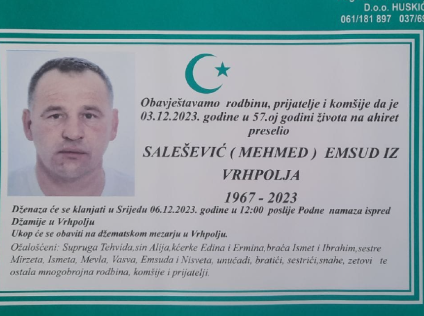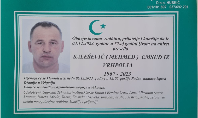 Obavještavamo rodbinu, prijatelje i komšije da je 03.12.2023. godine u 57.oj godini života na Ahiret preselio SALEŠEVIĆ (MEHMED) EMSUD.