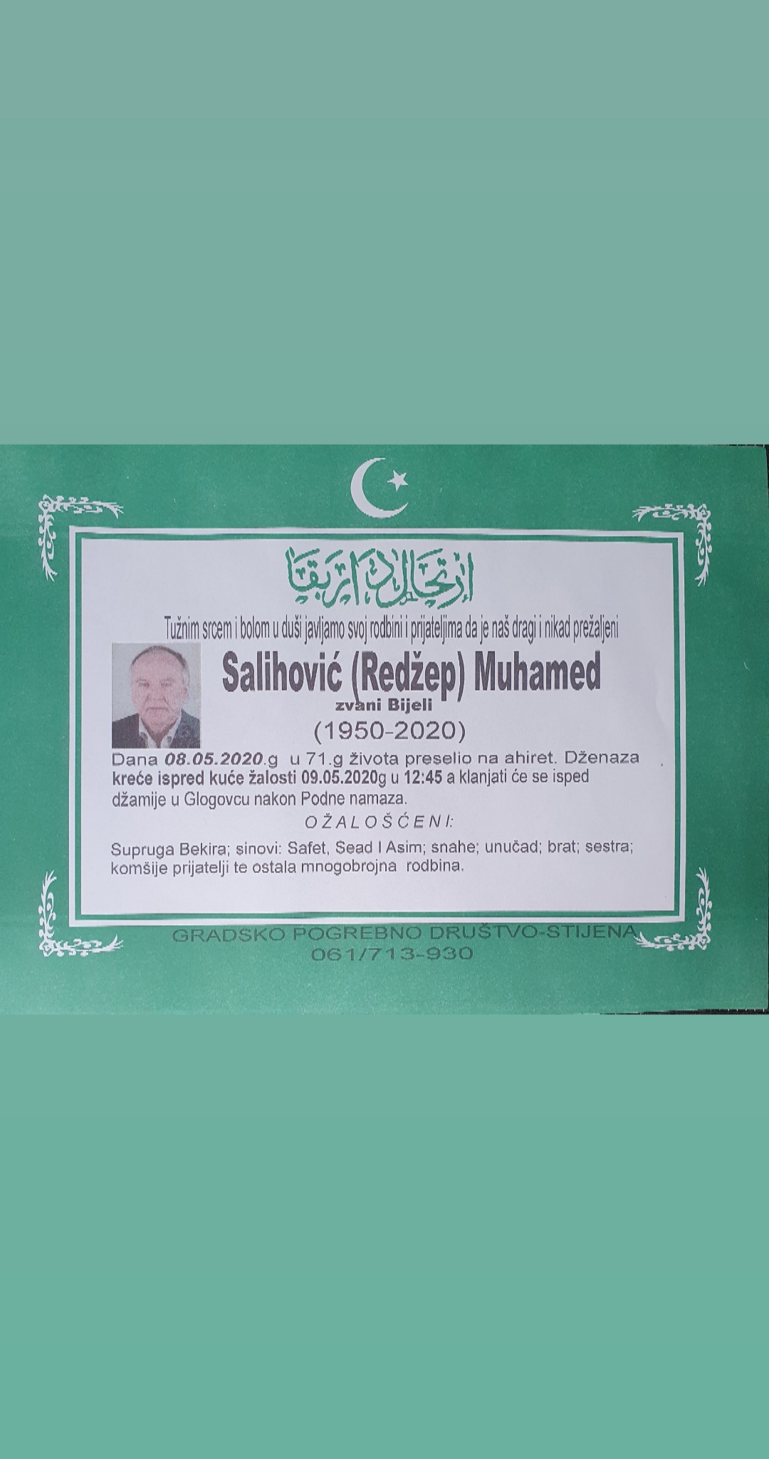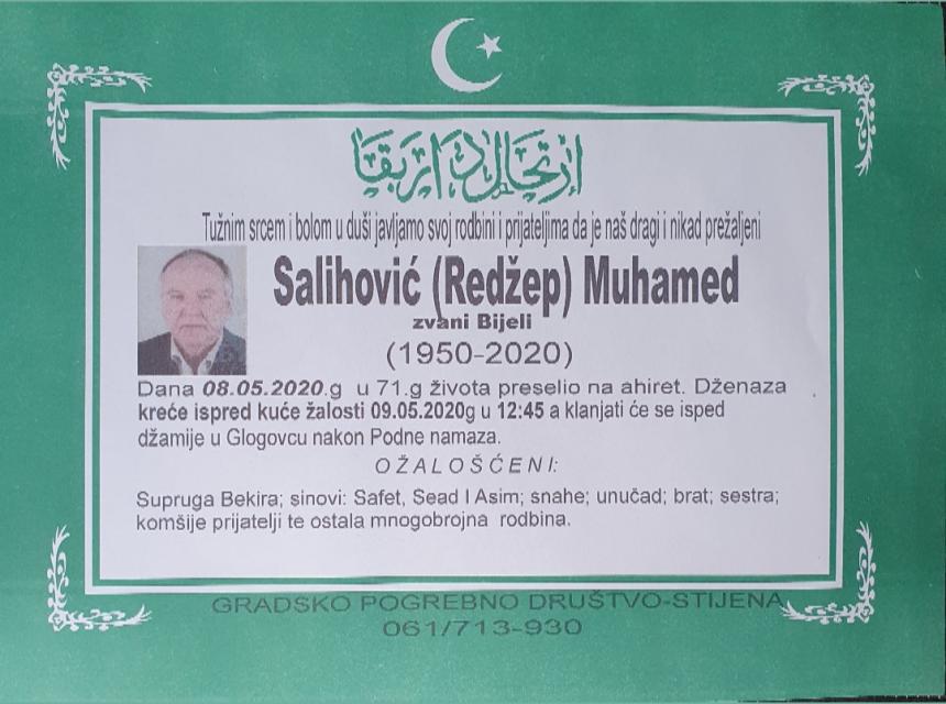 Teškim srcem i bolom u duši javljamo da je naš dragi i nikad prežaljeni Salihović (Redžep) Muhamed dana 08.05.2020.godine u 71-oj godini života preselio na Ahiret.