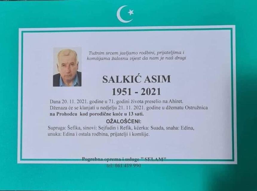Tužnim srcem i bolom u duši javljamo rodbini, prijateljima i komšijama da nam je naš dragi Salkić Asim, dana 20.11.2021, u 71. godini života preselio na Ahiret. Dženaza će se klanjati u nedjelju(danas) dana, 21.11.2021. godine u džematu Ostružnica na Prohodcu kod porodične kuće u 13h.
