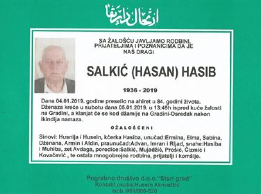 Sa žalošću javljamo rodbini, prijateljima i poznanicima da je naš dragi Salkić (Hasan) Hasib dana 04.01.2019. godine preselio na Ahiret u 84-toj godini života.