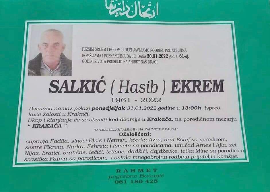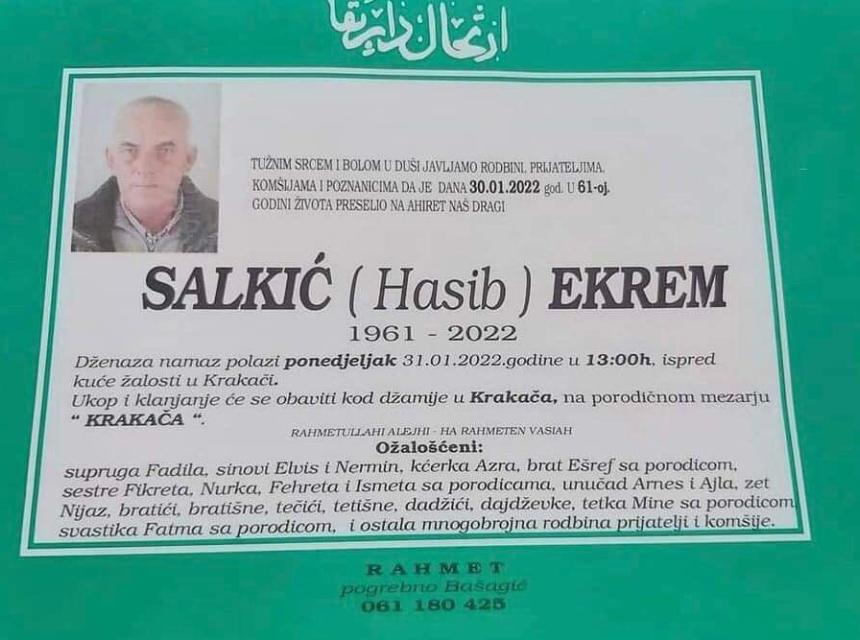 Tužnog srca i s bolom u duši obavještavamo rodbinu, komšije i prijatelje da je naš dragi Salkić (Hasib) Ekrem, dana 30.01.2022. godine, u 61-oj godini života, preselio na Ahiret.