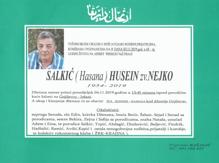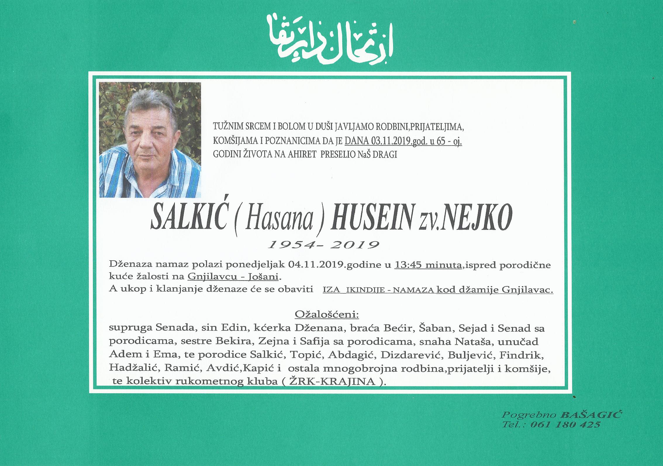Sa žalošću, bolom i tugom javljamo rodbini, prijateljima i poznanicima da je naš dragi Salkić Husein zv.Nejko, 03.11.2019.g. preselio na Ahiret u 65. g. života.