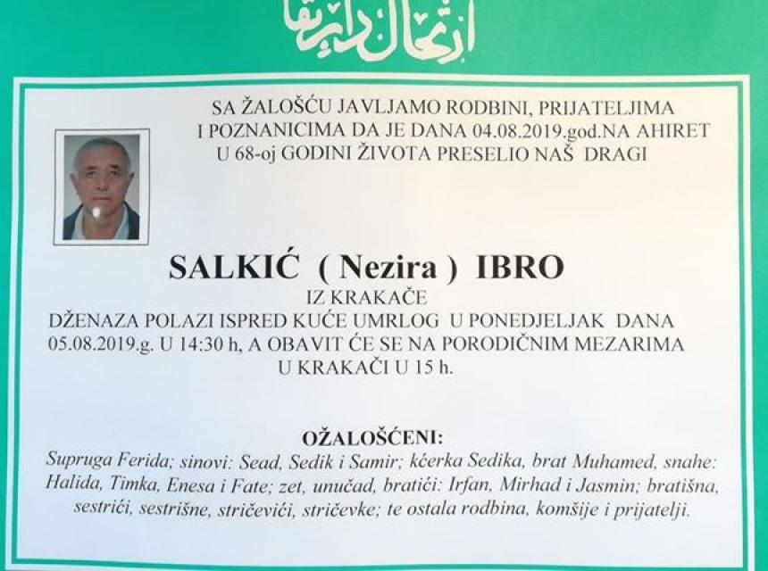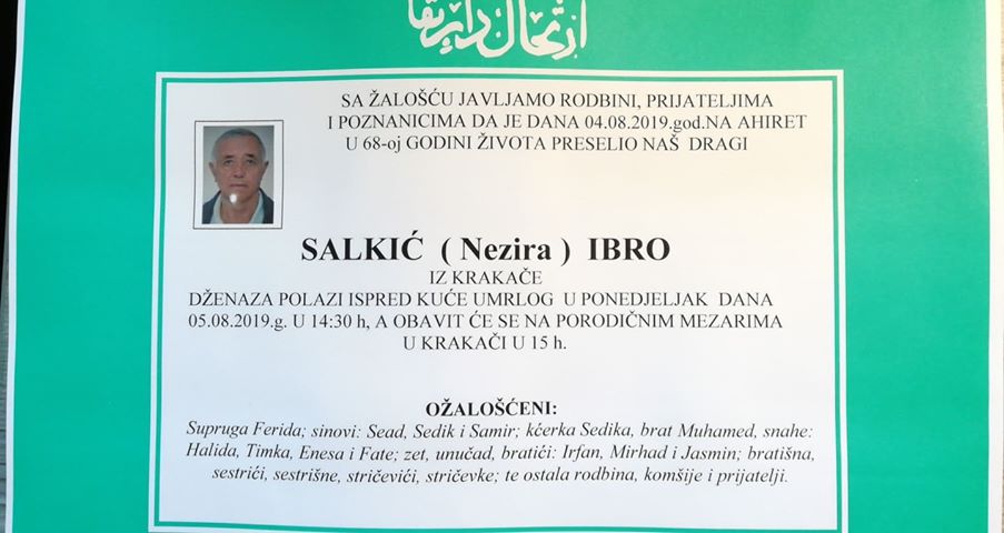 Sa žalošću javljamo rodbini, prijateljima i poznanicima da je dana 04.08.2019.god. na Ahiret u 68-oj godini života preselio naš dragi Salkić (Nezira) Ibro. Dženaza polazi isored kuće umrlog u ponedjeljak dana 05.08.2019. u 14:30, a ibavit će se na porodičnim mezarima u Krakači u 15:00.