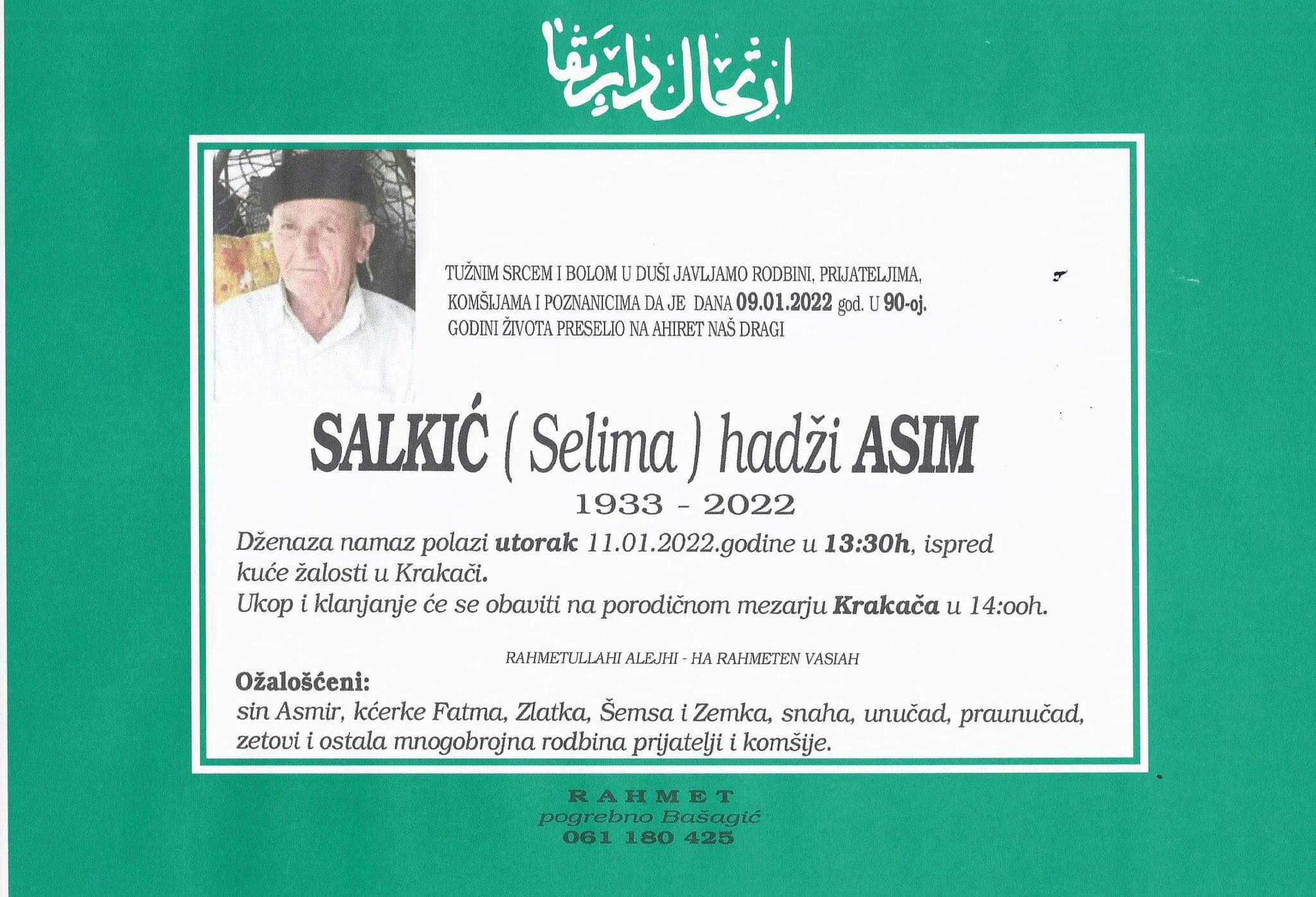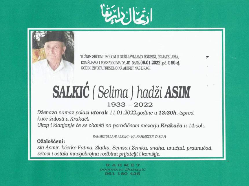 Tužnog srca i s bolom u duši obavještavamo rodbinu, komšije i prijatelje da je naš dragi Salkić (Selima) hadži Asim, dana 09.01.2022. godine, u 90-oj godini života, preselio na Ahiret.