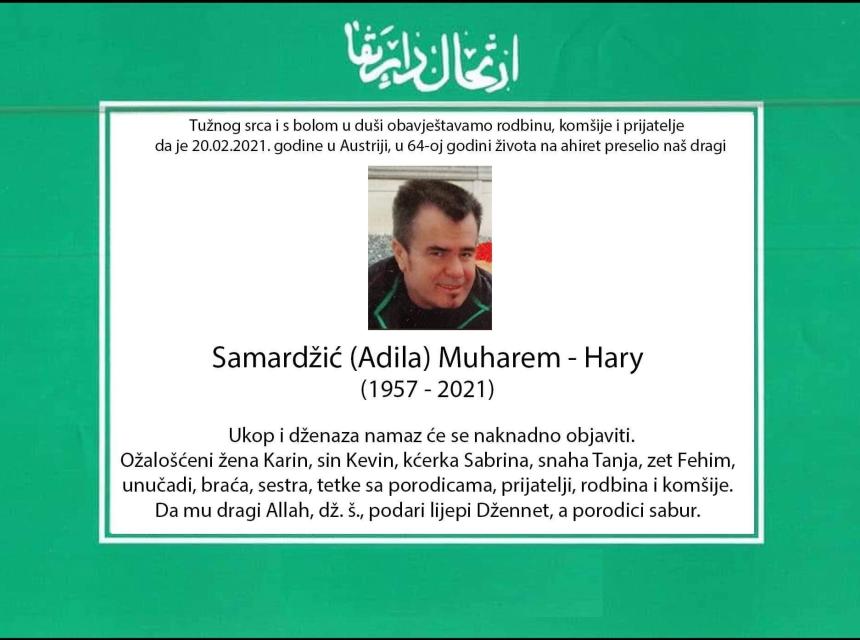 Tužnog srca i s bolom u duši obavještavamo rodbinu, komšije i prijatelje da je Samardžić (Adila) Muharem- Hary 20.02.2021. godine, u 64. godini života preselio na Ahiret.
