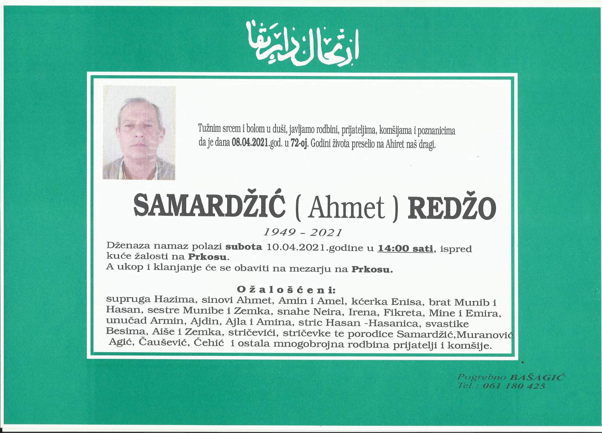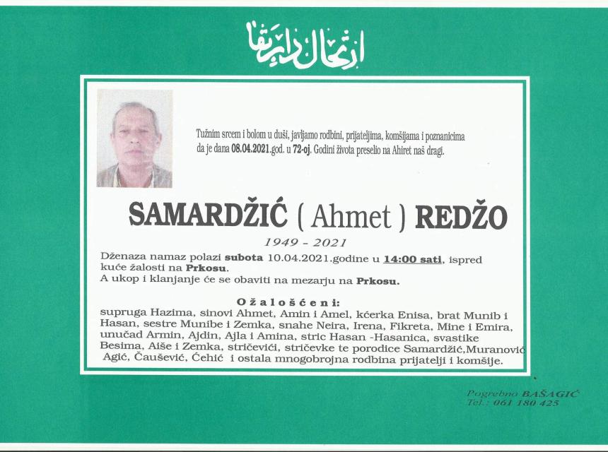 Tužnog srca i s bolom u duši obavještavamo rodbinu, komšije i prijatelje da je naš dragi Samardžić (Ahmet) Redžo 08.04.2021. godine, u 72. godini života preselio na ahiret.