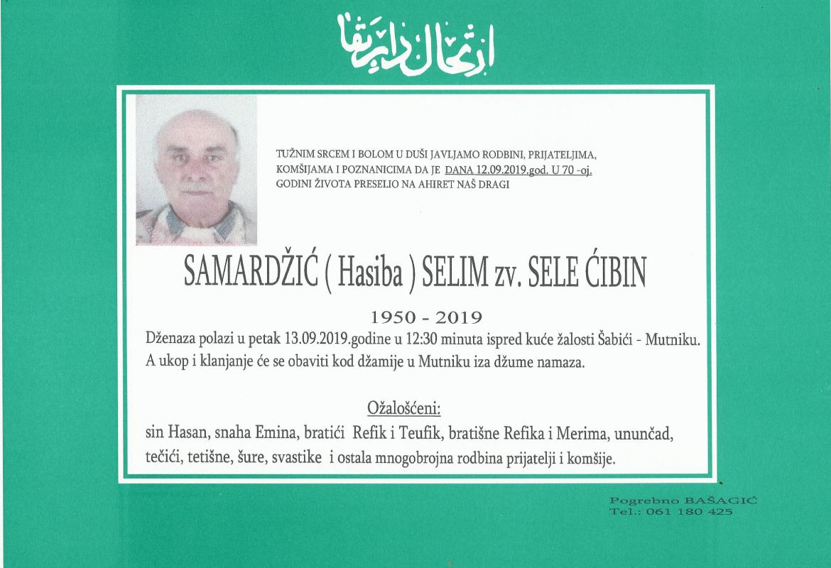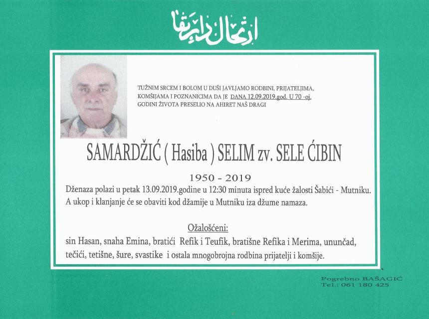 Tužnim srcem i bolom u duši, javljamo rodbini, prijateljima, komšijama i poznanicima da je dana 12.09.2019.god.u 70-oj. godini života preselio na Ahiret naš dragi Samardžić (Hasiba) Selim.