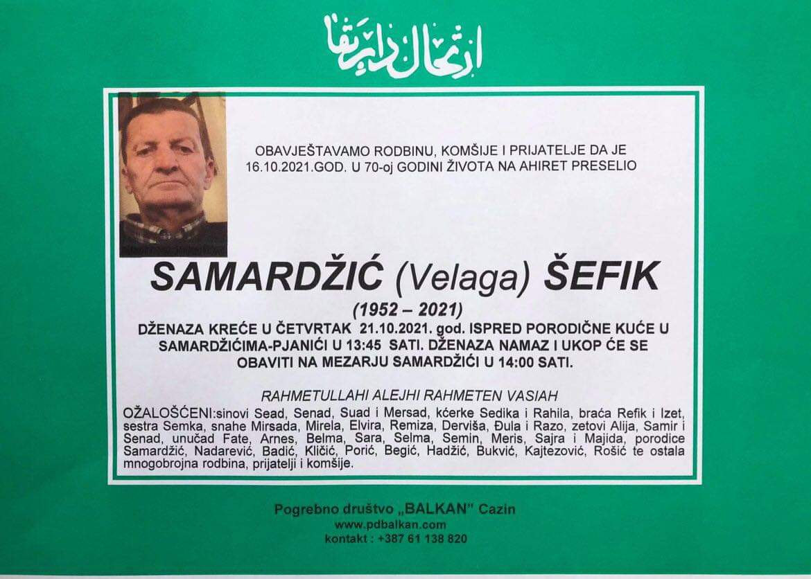 Tužnog srca i s bolom u duši obavještavamo rodbinu, komšije i prijatelje da je naš dragi Samardžić (Velaga) Šefik dana 16.10.2021. u 70. godini preselio na ahiret.