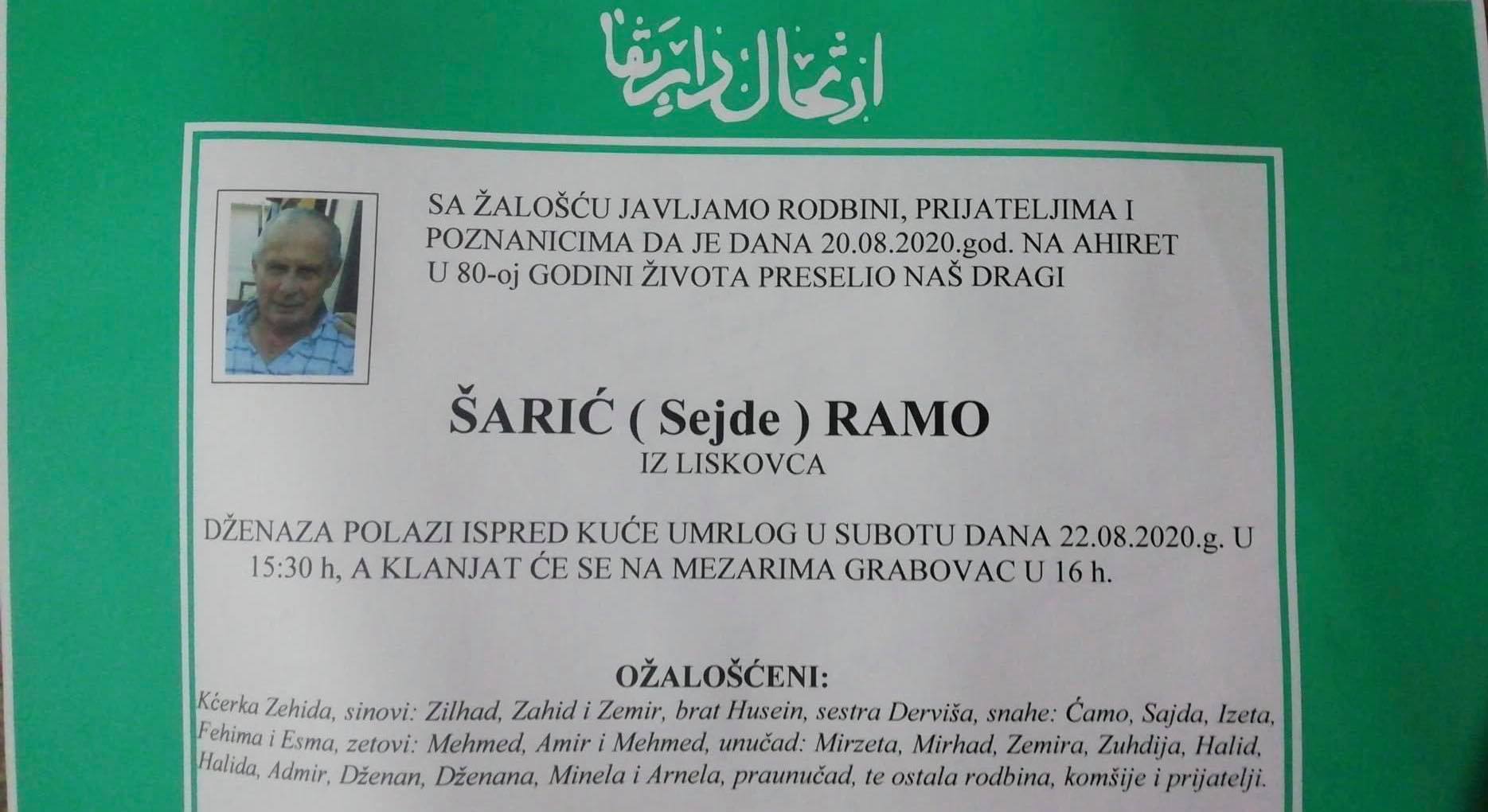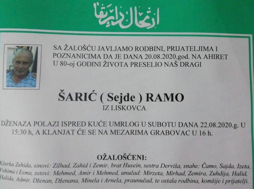 Tužnog srca i s bolom u duši obavještavamo rodbinu, komšije i prijatelje da je naš dragi Šarić (Sejde) Ramo iz Liskovca, dana 20.08.2020. godine, u 80-oj. godini života, preselio na Ahiret.