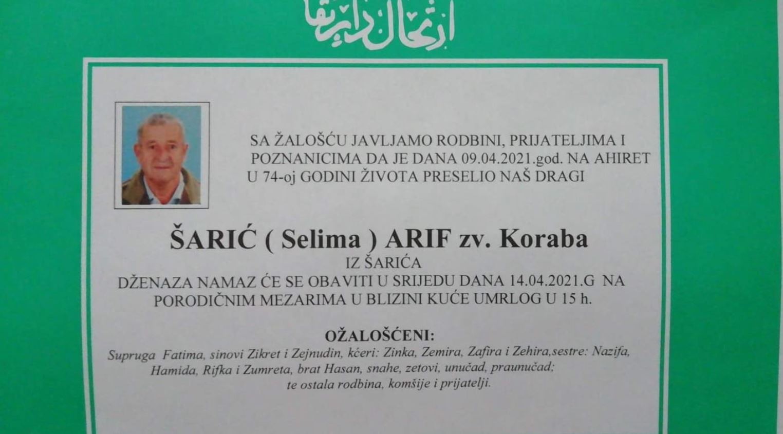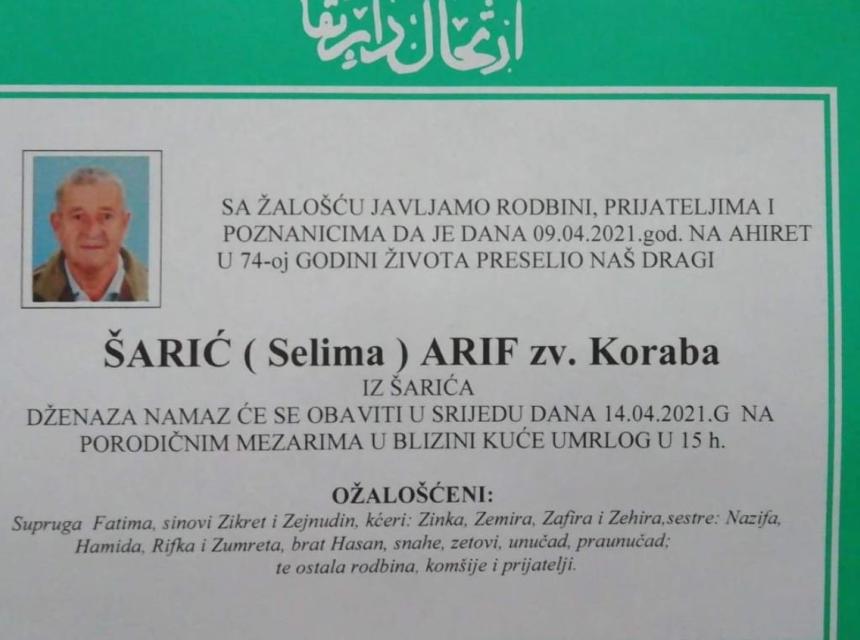 Tužnog srca i s bolom u duši obavještavamo rodbinu, komšije i prijatelje da je naš dragi Šarić (Selima) Arif zv. Koraba, 09.04.2021. godine, u 74. godini života preselio na Ahiret.