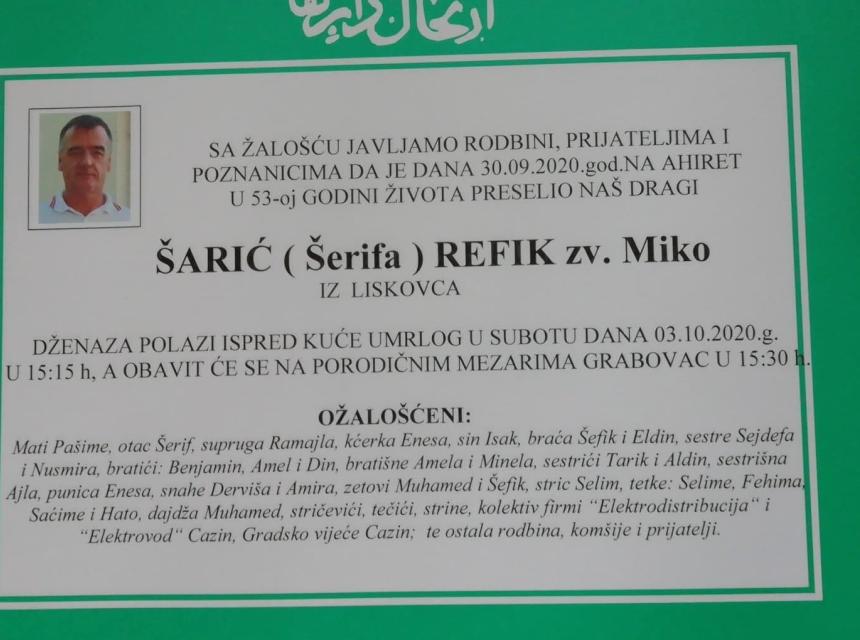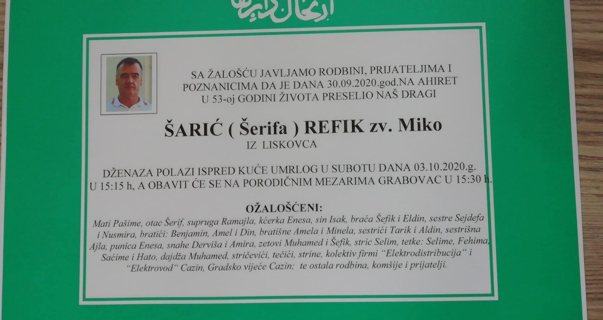Tužnog srca i s bolom u duši obavještavamo rodbinu, komšije i prijatelje da je naš dragi Šarić (Šerifa) Refik zv. Miko preselio na Ahiret, dana 30. septembra 2020. godine u 53. godini života.