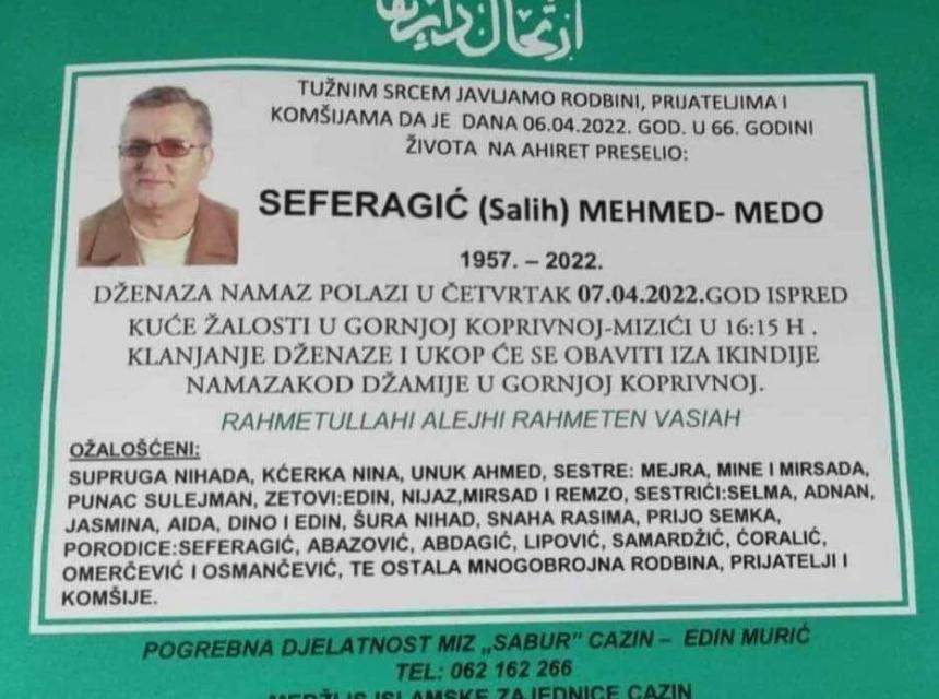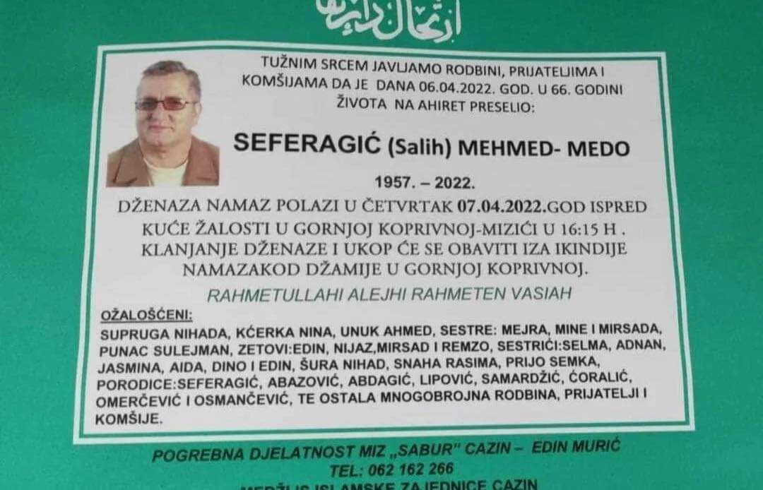 Tužnog srca i s bolom u duši obavještavamo rodbinu, komšije i prijatelje da je naš dragi Seferagić (Salih) Mehmed- Medo u 66. godini života preselio na Ahiret.