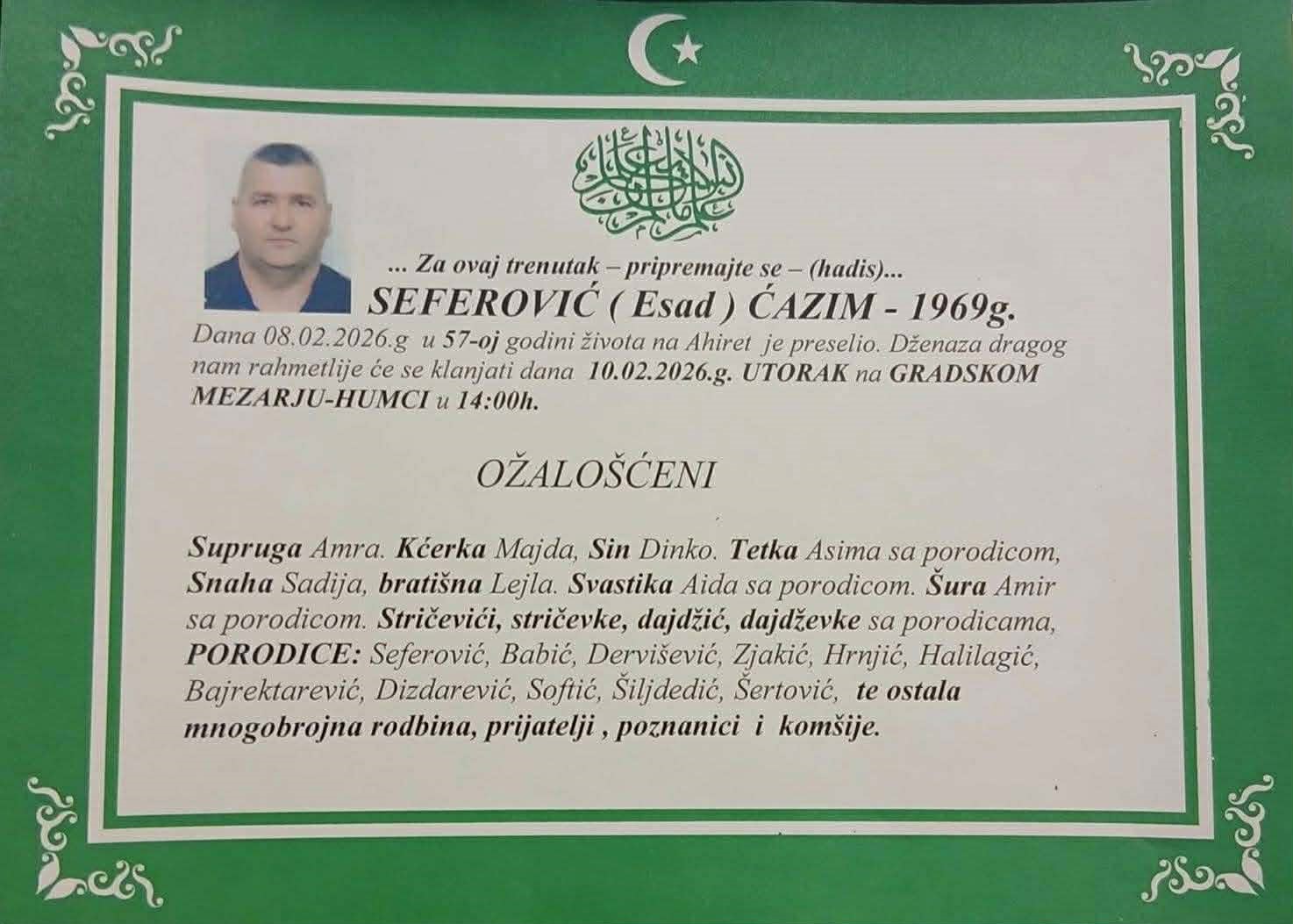 Obavještavamo rodbinu, prijatelje i poznanike da je SEFEROVIĆ (Esad) ĆAZIM dana 08.02.2026. g. u 57-oj godini života na Ahiret je preselio.