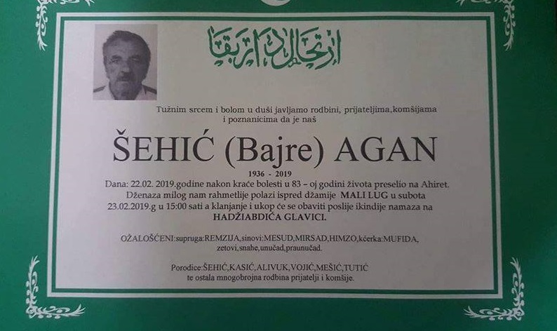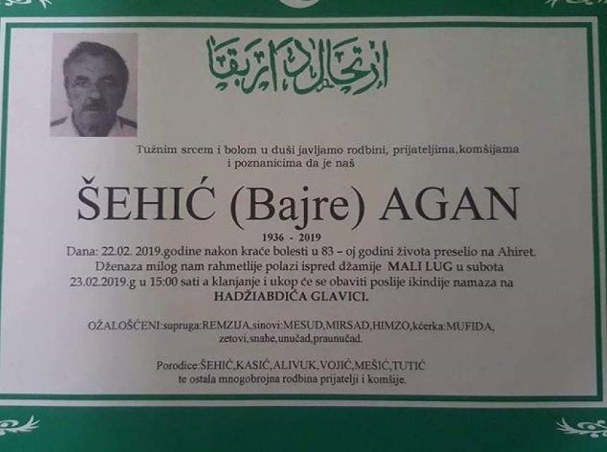 Tužnim srcem u duši javljamo rodbini, prijateljima, komšijama i poznanicima da je dana 22.02.2019.godine nakon kraće bolesti u 83-oj. godini života na Ahiret preselio naš Šehić (Bajre) Agan.