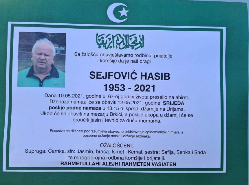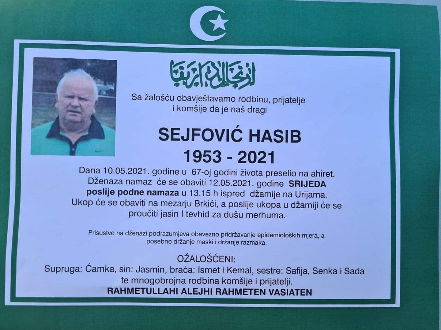 Tužnog srca i s bolom u duši obavještavamo rodbinu, komšije i prijatelje da je naš dragi Sejfović Hasib 10.05.2021. god u 67. godini života preselio na ahiret.