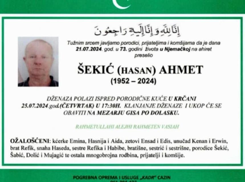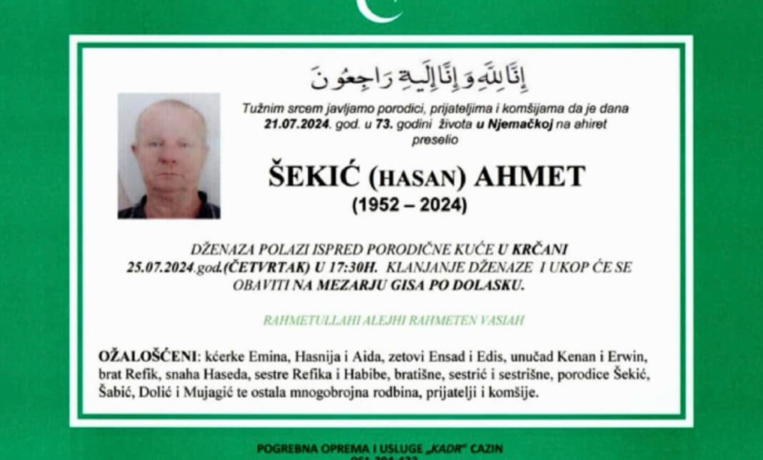 Tužnim srcem i bolom u duši javljamo rodbini, prijateljima i komšijama da je naš dragi Šekić (Hasan) Ahmet, dana 21.07.2024. godine u 73-oj godini života u Njemačkoj, preselio na Ahiret.