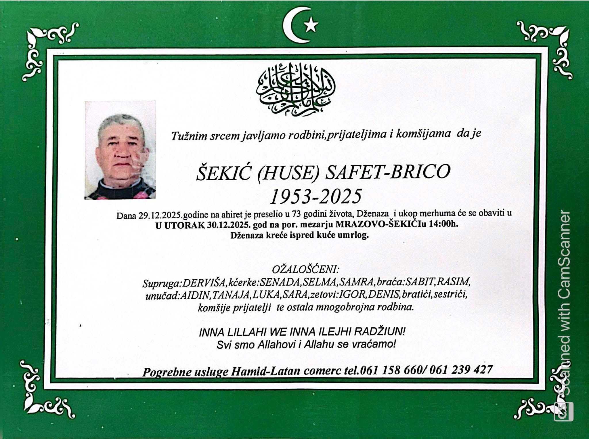 Dženaza i ukop merhuma će se obaviti u utorak, 30.12.2025. godine, na porodičnom mezarju Mrazovo – Šekići u 14:00 sati.