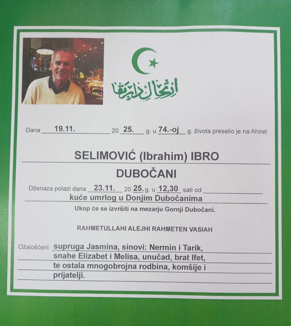 Dženaza polazi dana 23.11. 2025. g. u 12,30 sati od kuće umrlog u Donjim Dubočanima.