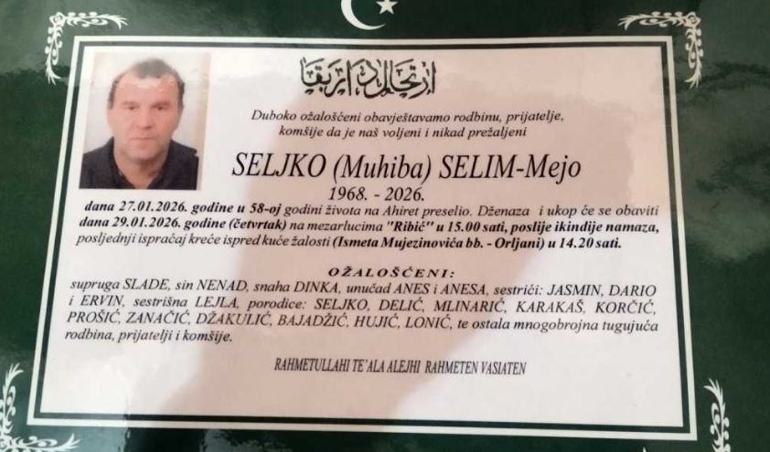 Dženaza i ukop će se obaviti dana 29.01.2026. godine (četvrtak) na mezarlucima “Ribić” u 15.00 sati, poslije ikindije namaza, ispraćaj kreće ispred kuće žalosti (Ismeta Mušimovića bb – Orljani) u 14.20 sati.
