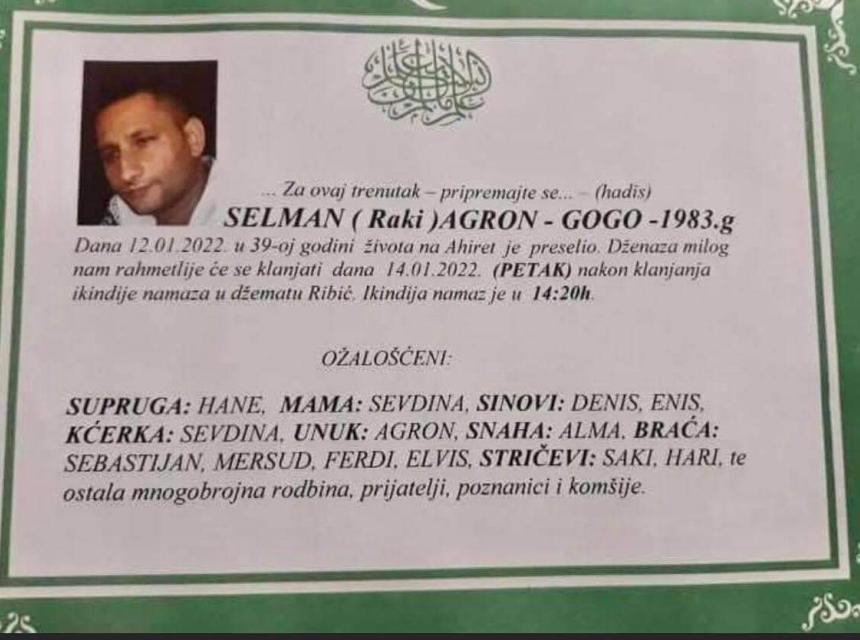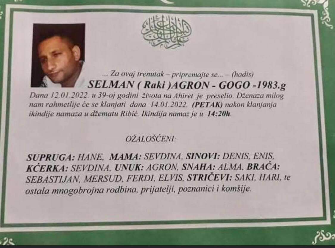 Tužnog srca i s bolom u duši obavještavamo rodbinu, komšije i prijatelje da je naš dragi Selman (Raki) Agron-Gogo 12.1.2022. u 39. godini života preselio na ahiret.