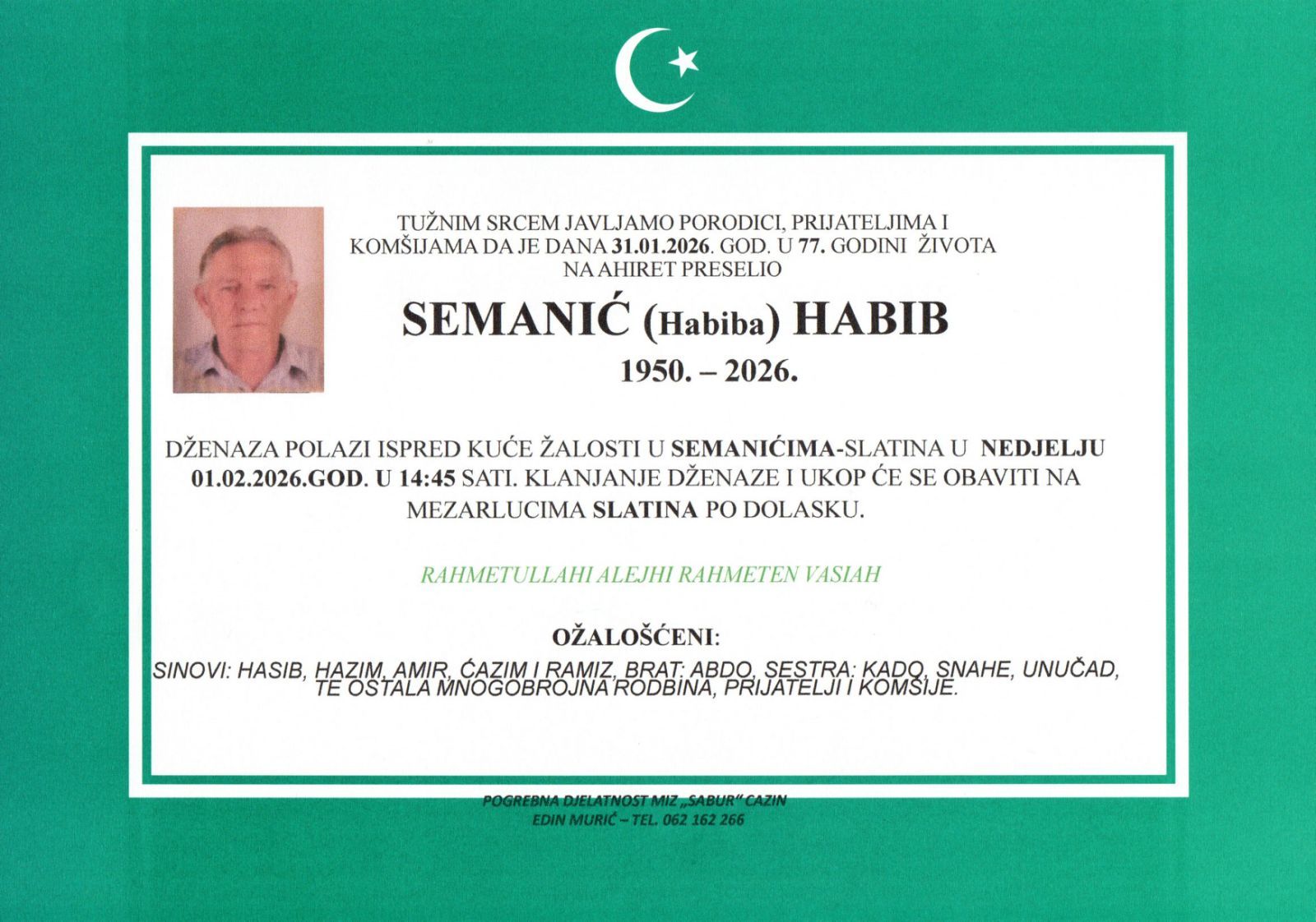TUŽNIM SRCEM JAVLJAMO PORODICI, PRIJATELJIMA I KOMŠIJAMA DA JE DANA 31.01.2026. GOD. U 77. GODINI ŽIVOTA NA AHIRET PRESELIO