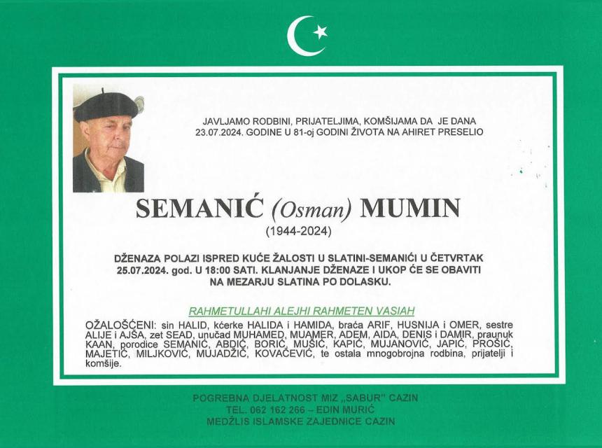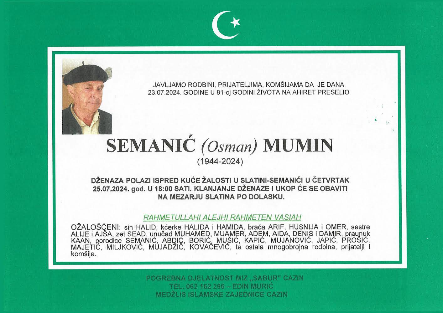 Tužnim srcem javljamo rodbini, prijateljima i komšijama da je dana 23.07.2024. god. u 81. godini života na ahiret preselio Semanić (Osman) Mumin