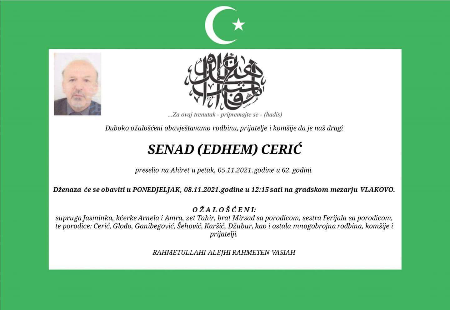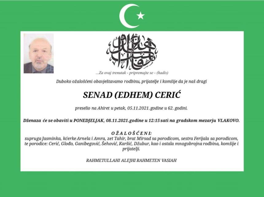 Tužnog srca i s bolom u duši obavještavamo rodbinu, komšije i prijatelje da je naš dragi Senad (Edhem) Cerić dana 05.11.2021. u 62. godini života preselio na ahiret.
