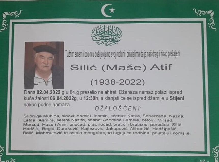 Tužnog srca i s bolom u duši obavještavamo rodbinu, komšije i prijatelje da je naš dragi Silić (Maše) Atif u 84. godini života preselio na Ahiret.