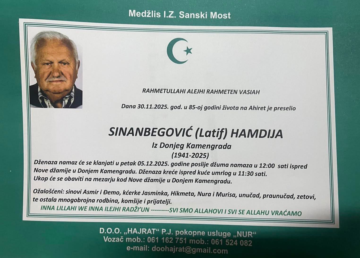 Dženaza-namaz će se klanjati u petak, 05.12.2025. godine, poslije džuma-namaza u 12:00 sati ispred Nove džamije u Donjem Kamengradu. Dženaza kreće ispred kuće umrlog u 11:30 sati.