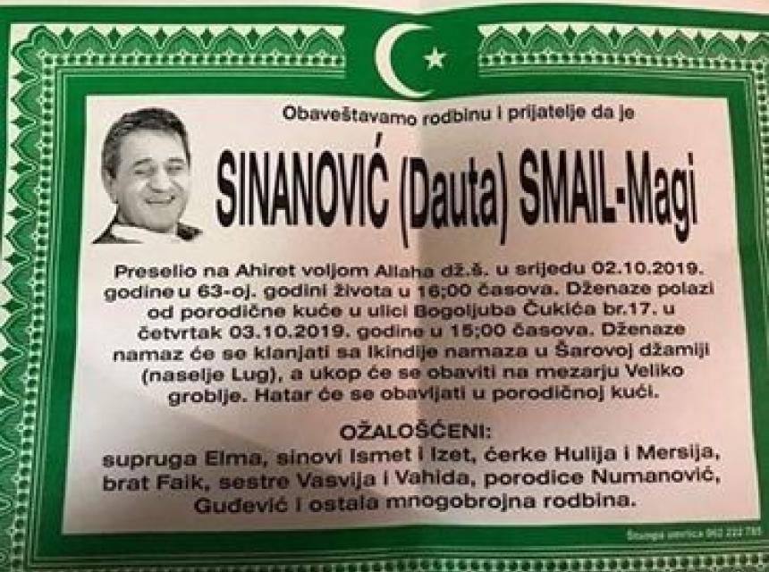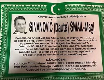 Obavještavamo rodbinu i prijatelje da je Sinanović (Dauta) Smail - Magi preselio na Ahiret voljom Allaha dž.š., u srijedu 02.10.2019. godine u 63-oj godini života u 16:00 časova.